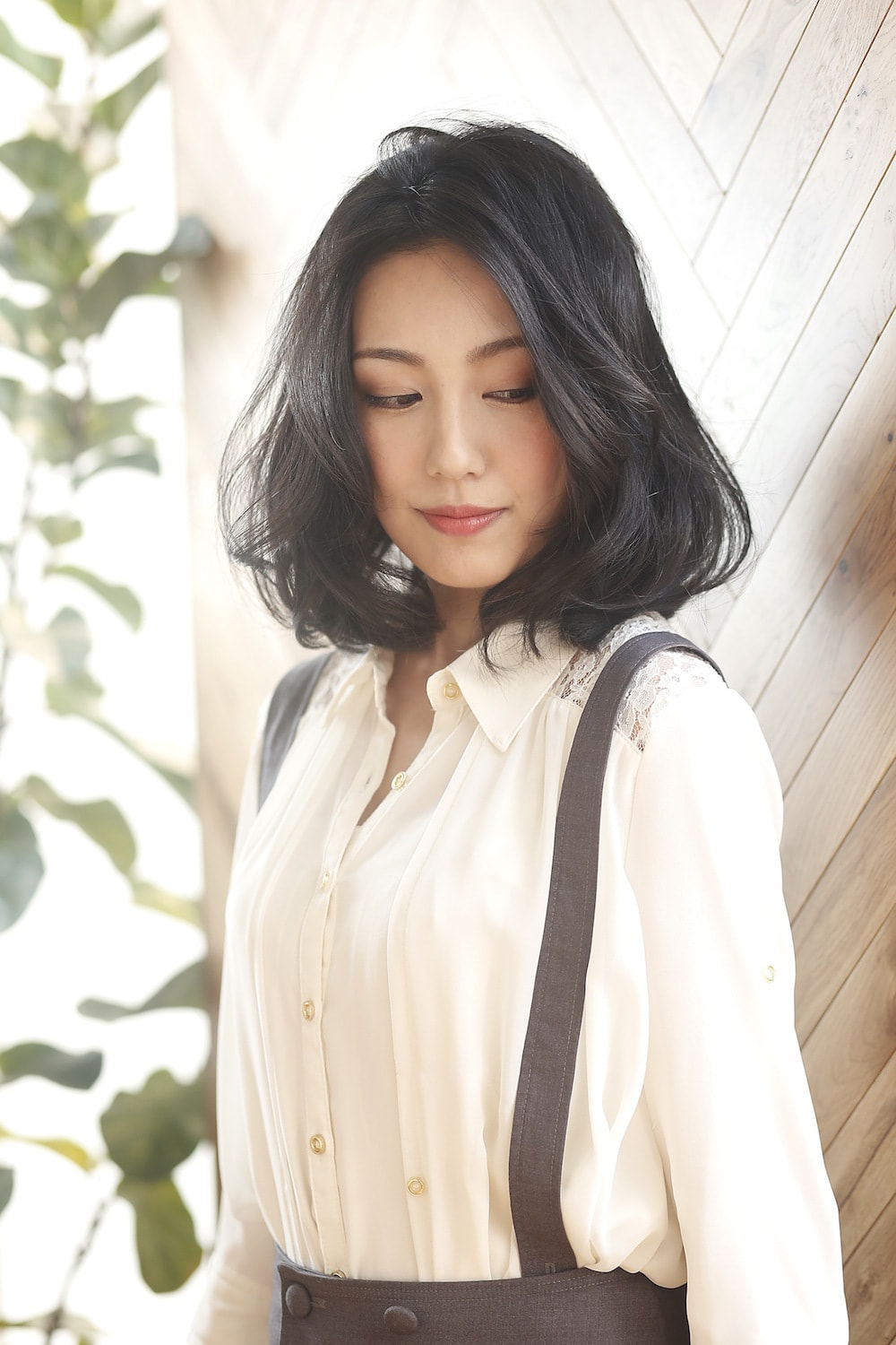 伸ばし中の毛量が多くかたい髪質で重たく見える黒髪ワンレンボブには、ミックスカールを顔周り中心にラフにかけることで大人のしっとりしたウェーブに変身